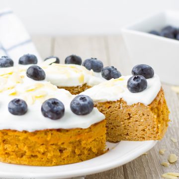 • Quando o bolo arrefecer, barrar com um pouco de iogurte grego ligeiro batido com adoçante e acrescentar uns mirtilos ou outra fruta!