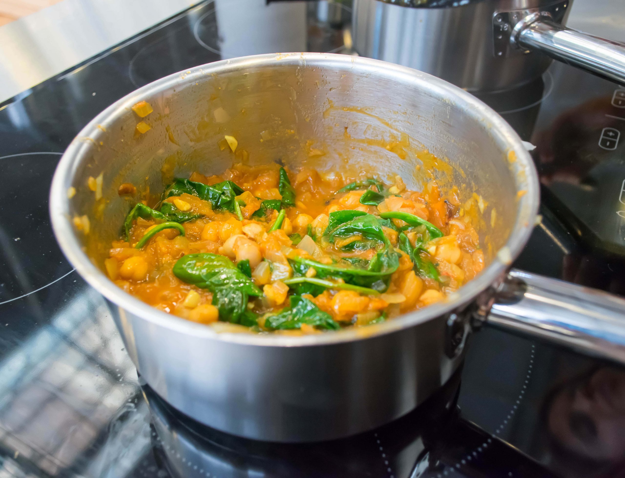 - Por fim, juntar os espinafres até que fiquem ligeiramente amolecidos (se usar placa de fogão, desligar assim que colocar os espinafres, visto que se mantém quente mais alguns minutos.)